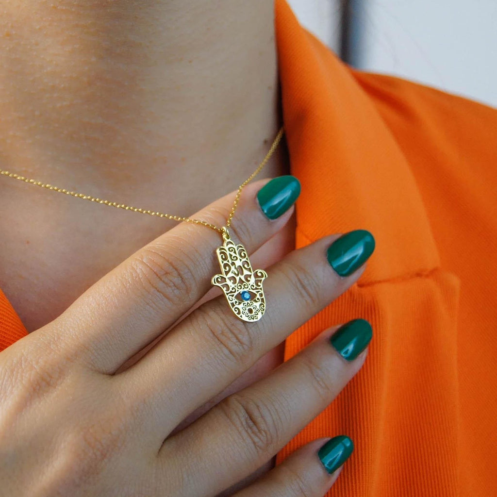 عقد خميسة من الفضة الخالصة عيار 925 مطلي بالروديوم، مرصّع بحجارة الزركون اللامعة.